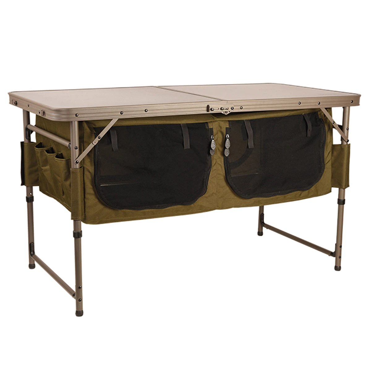 Een 2-in-1 oplossing die een grote tafel combineert met opslagruimte eronder. Deze tafel is perfect om te gebruiken in de grotere bivvies om bijvoorbeeld het kookgerei en ander materiaal in te bewaren.