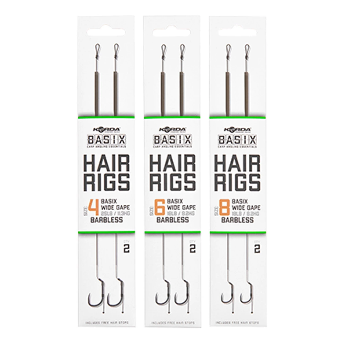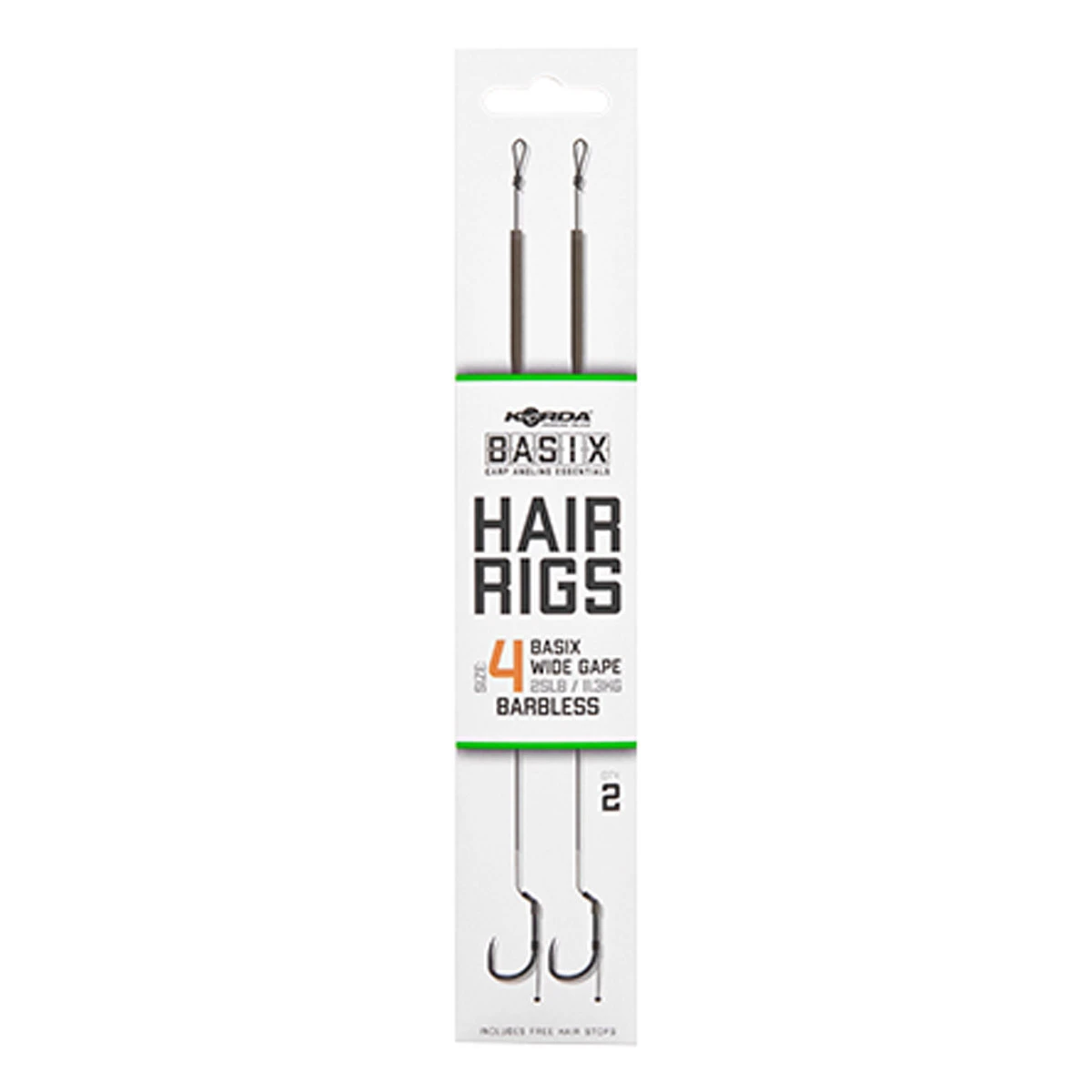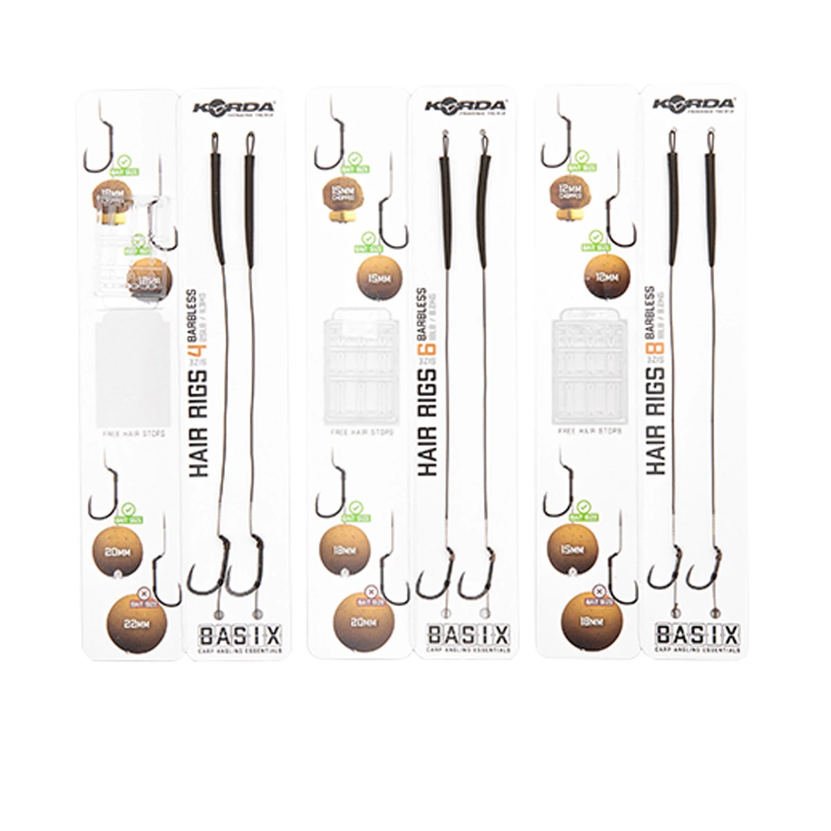 De Basix Ready Tied Hair Rigs zijn klaar om gelijk uit de verpakking gebruikt te worden. Je hoeft enkel nog een bodemaas of wafter toe te voegen en je bent klaar om te vissen. De rigs zijn geknoopt met het camo green gekleurde Basix Coated Hooklink materiaal. Een klein gestript stukje bij de Basix Wide Gape haak zorgt voor bewegingsvrijheid en grotere kans op goede inhaking. De onderlijn heeft een soepele hair die is voorzien van een stukje silicone die hem op zijn plek houdt en de kans op in de war werpen verkleint. De lengte van de hair is geoptimaliseerd voor haakaas formaten die passen bij de gekozen haakmaat.