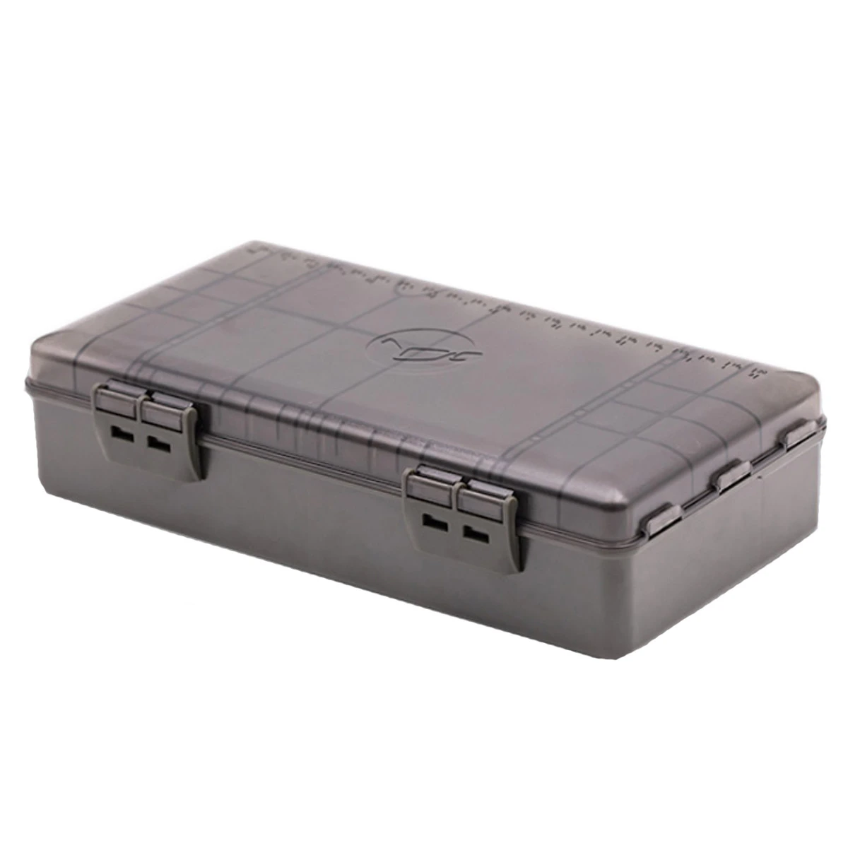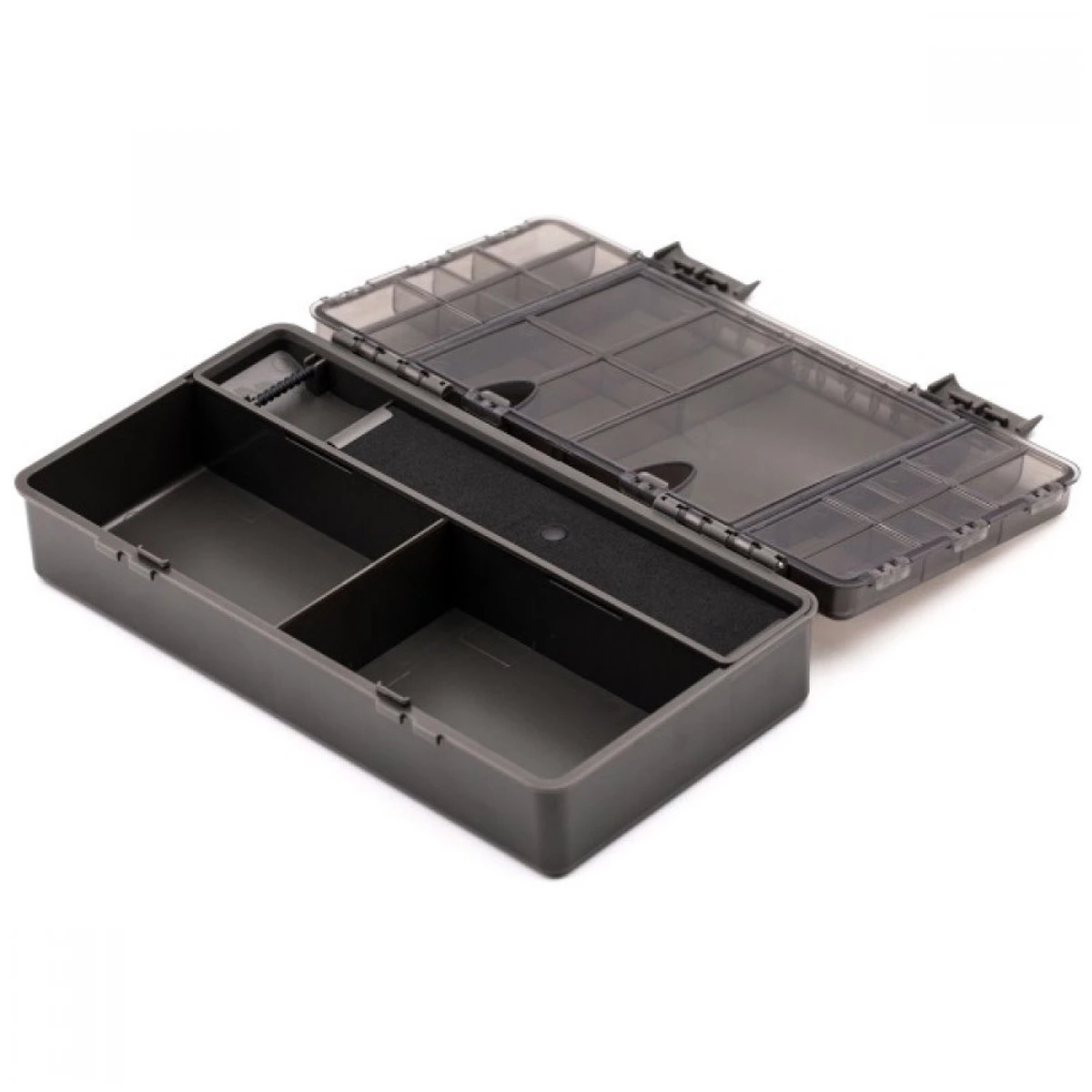 De Basix Tackle Box is ontworpen om voldoende opbergruimte te bieden voor al je rig-bits, terwijl het gemakkelijk is om ze te organiseren en te vinden wanneer dat nodig is. Het is gemaakt van schokbestendig, slagvast plastic, met een doorschijnend deksel zodat u naar binnen kunt kijken. Het deksel is voorzien van een liniaal waarmee u uw rigs nauwkeurig kunt meten en wordt vastgemaakt via twee vergrendelingen om te voorkomen dat het tijdens het transport opengaat. In het deksel van de Basix Tackle Box bevinden zich 21 kleine compartimenten met sluitingen van verschillende afmetingen, die perfect zijn voor het opbergen van items zoals loodclips en wartels. In de doos bevinden zich twee grote compartimenten, met vaste verdelers, die perfect zijn voor rig-tools, hooklink-spoelen en dergelijke. Het beschikt ook over een verwijderbare rig-lade, compleet met pinnen, die kan worden gebruikt om maximaal acht voorgeknoopte rigs op te bergen (zoals de Basix Ready Tied Hair Rigs), en daaronder is nog een lang opbergvak.