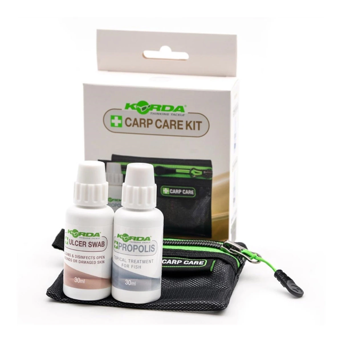 Deze kit is speciaal ontwikkeld door Korda zodat nu iedereen een first aid kit in zijn tas kan hebben voor een gewonde vis. Deze first aid kit bevat twee flesjes, één is speciaal gemaakt om wonden te verzorgen die in/rond de mond zitten en de andere is speciaal ontwikkeld voor beschadigingen op het lichaam. De werking van dit product is getest en zal eigenlijk meer gepromoot moeten worden. Met een klein beetje vloeistof op de wond geef je voortaan de vis de best mogelijke kans op herstel. De flesjes worden geleverd inclusief wattenstaafjes en een praktisch tasje.
