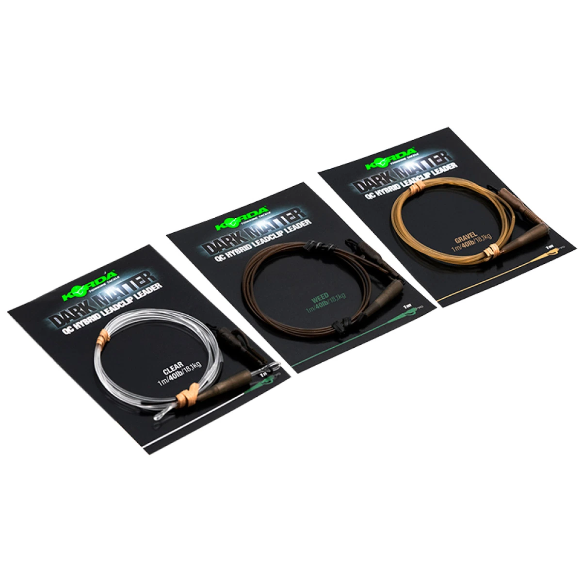 De Korda Dark Matter Leader is nu ook uitgevoerd met de handige QC hybrid clip. Deze QC clips maken het mogelijk om razendsnel van onderlijn en lood te kunnen wisselen en zorgen daardoor voor meer effectieve vistijd. Op een aantal plekken van de leader is er tungsten in verwerkt, zodat deze vlak over de bodem blijft liggen.