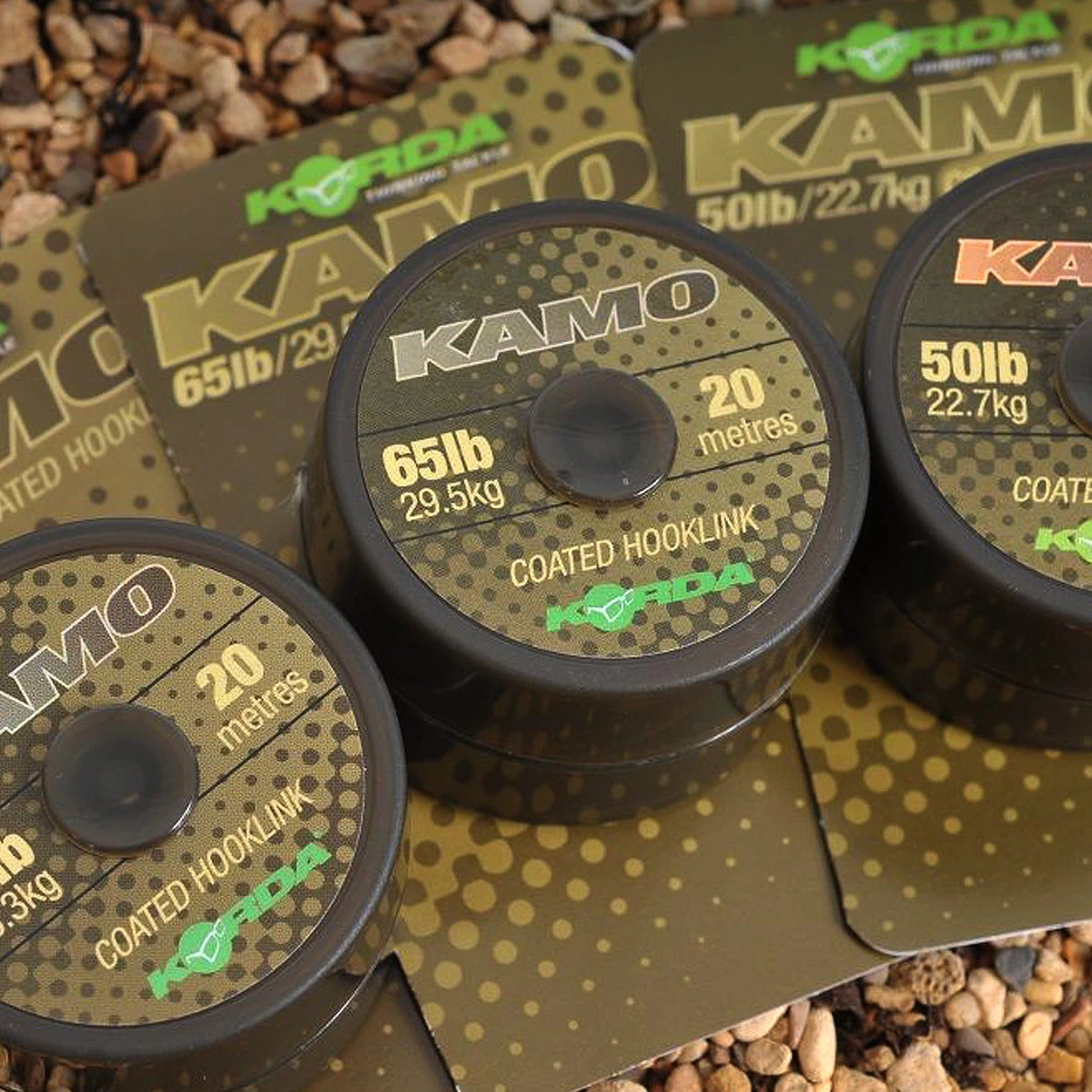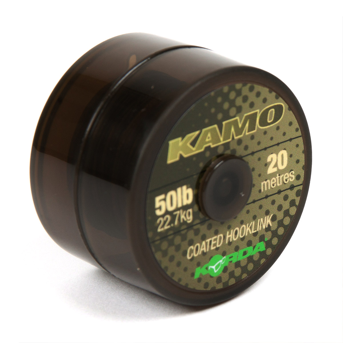 Korda Kamo Coated Hooklink is een schitterend gecoat onderlijnmateriaal. Door de extreme soepelheid en two-tone camokleuren valt dit onderlijnmateriaal weg tegen bijna iedere bodemkleur. Korda Kamo Coated onderlijn is makkelijk te strippen en daarnaast is de snelzinkende onderlijn ook nog eens supersterk.