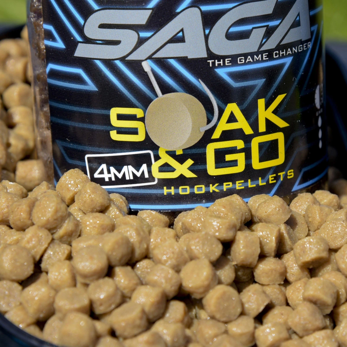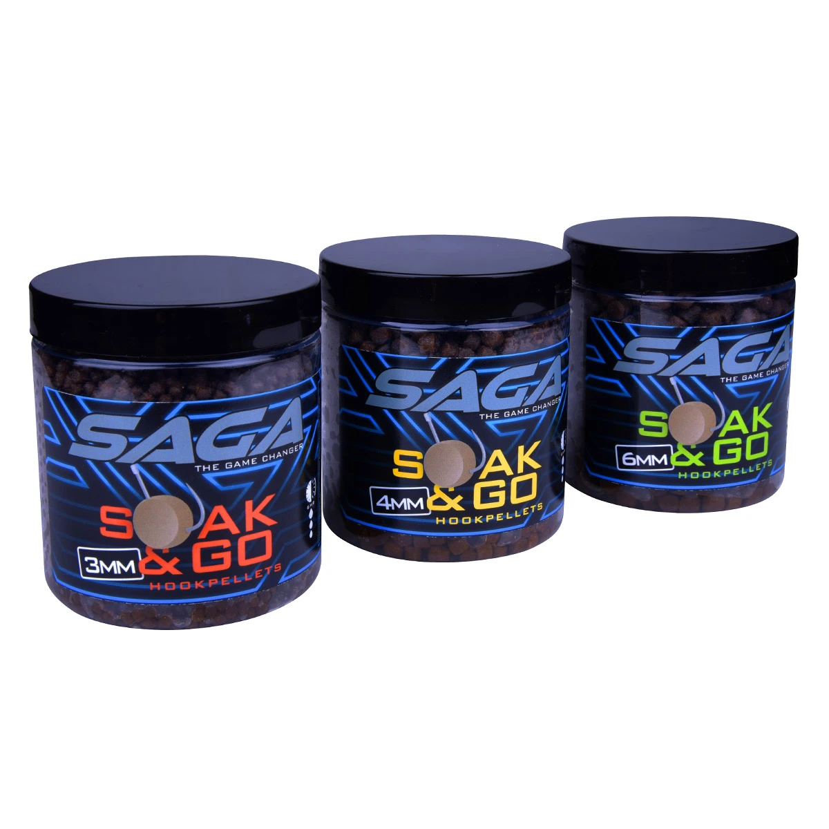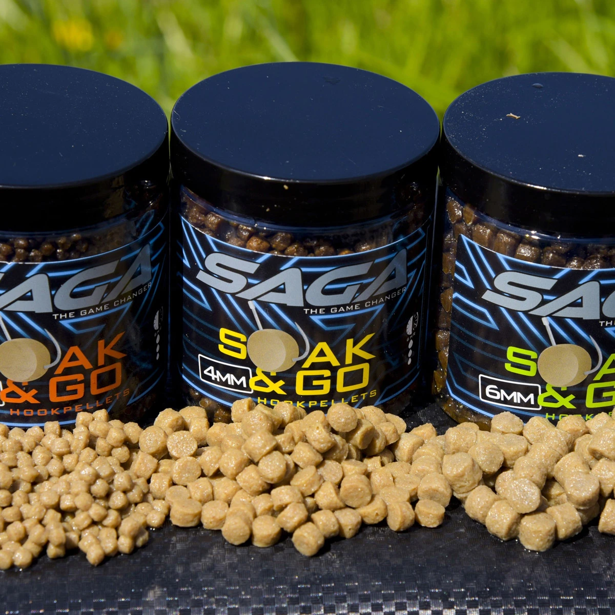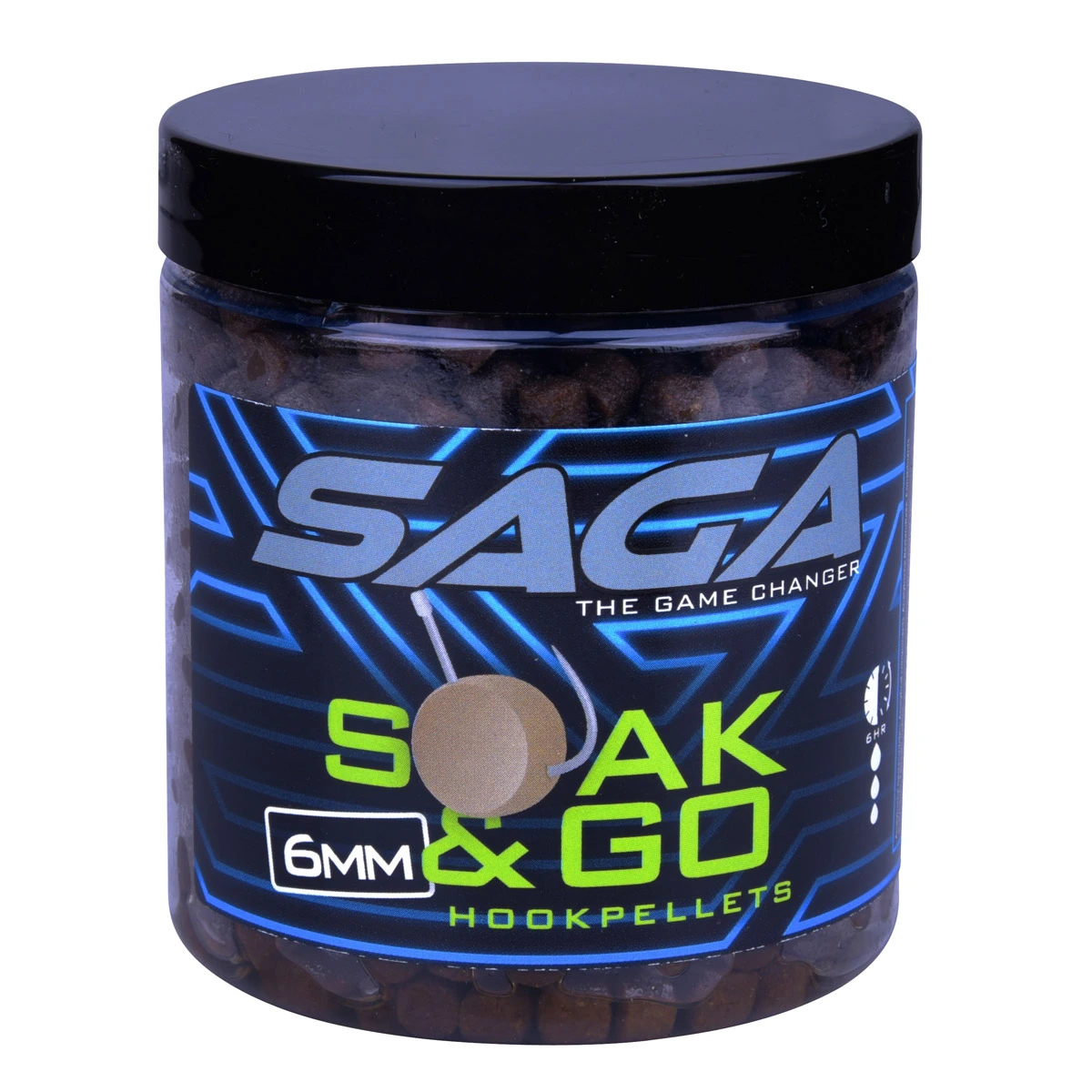 De Soak & Go Hookpellets vormen een haakaas waar alle soorten vis op commercials gek van zijn. Door deze pellets simpelweg onder water te plaatsen(6h), zwellen ze gelijkmatig op en worden ze tot in de kern zacht. Hierdoor zijn ze eenvoudig op een haak te prikken zonder dat ze open scheuren. Het gebruik van een pelletpomp behoort nu dus tot het verleden. Soak & Go Hookpellets zijn verkrijgbaar in 3,4, en 6mm uitvoering, waardoor ze op alle formaten vis en in elk jaargetijde inzetbaar zijn. Saga Soak & Go pellets worden geleverd in een handig hersluitbaar potje.