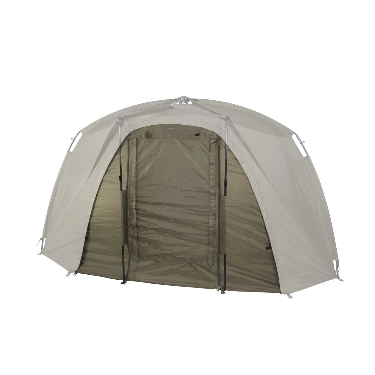 De verlengde zijkanten en achterkant bieden bovendien volledige dekking van de dubbele huid van boven tot onder. De Tempest Brolly 100 Skull Cap Wrap kan eenvoudig in enkele seconden worden gemonteerd via een spigot-systeem op de drie voorste palen en wordt vervolgens eenvoudig rond de bivvy vastgemaakt met de ventilatieopeningen aan de achterkant. Op deze manier kun je als het warmer wordt gemakkelijk weer lucht door je schuilplaats kunt laten stromen. Zo zorgt de Skull Cap Wrap ervoor dat het op warme dagen een stuk koeler blijft in je bivvy.